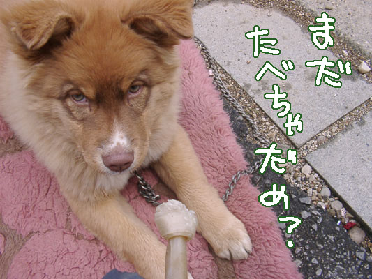 | 05.12.20「ごほうび」 シラクサ(人形新人)、昨日が発送開始予定日だったのですが、別段「発送しましたメール」とかも来なかったので、きっと沢山申し込みがあっただろうし締め切り近くに申し込んだみねの分は発送も後の方なんだろう…と思っていましたら、つい今さっき届きました(PM8:00過ぎ)。冬ボ支給日だったし、これぞ自分にごほうび(笑)。 そして今日でくるるが家に来て2年になりました。先日kasis様にいただいたビンテージビーズとレースでチョーカーを作ってお祝い。本当は服も作るつもりだったんですけど、間に合わず。まあそれはおいおい、正月休みにでも。 …しかし……。ホントにお迎え日、いっしょになってしまいましたがな(笑)。こんなこともあるのですねー。 また ロペ…に限らずだと思うのですが、犬はしーしてる間、すごい神妙な顔をしてます(オスはあんまりしないかも知れません)。 そしてロペ、しーしている間に必ず1回はチラリとみねの顔を見上げます。これはムクもフンの時、時々やってた。この時、目を合わせない方がいいんだろうか、とちょっと思います(笑)。しーしてるの見られて嫌だなあと思ってるのか、それともしーしてる間にいなくなったら嫌だなあと思ってるのか…。 これも日曜に撮った写真。↓の続きで、噛んでたガムを取って、渡して、取って、とやったところ。 せっかく気分良くおざぶの上でかじってたのに、取られてちょっと、いやかなり恨めしげ。そしてやっぱり目やにが^^;食い意地が張ってるので「待て」はまだマスターしてないのですが、すごいがんばって「待て」してるように見えますね。 |