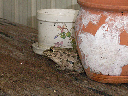 | 06.7.17「『ぬしさまへ』」 みね家の庭のヌシ(カエル苦手な人は見ないでくださいね!)。 去年あたりから目立って出没している、8cm近くありそうなとても立派なトノサマガエルです。同一蛙物かどうかはハッキリとは分かりませんが…。 昨日、ロペのいる車庫の横にある木に水をかけていたら(打ち水の原理?で涼しくなります)、その木からボターッとこのヌシさまが落ちてきてビックリしました(笑)。そのまま素晴らしいジャンプ力で別の植え込みに飛び込んでいかれました。 そして今朝はまたその車庫の横にある水道の下の土に浅い穴を掘って埋まっていらしたヌシさま、みねが気付かずロペの水飲みの水を換えようと蛇口をひねったら、穴からビョーンと飛び出してきて、昨日に引き続きびっくり…!いや向こうもビックリしたんでしょうけど。 カエルは虫を食べるから、たくさん蚊を取ってね〜と、昼間は眠そうな顔のヌシさまを撮りながら念を送っておきました。 さて、ロペですが、昨日病院に連れて行ってもらって、やっぱり膀胱炎だろう、ということでした。膀胱炎だと抗生物質を飲ませて治療するそうで、とりあえずその抗生物質を2週間飲ませて、それでトイレの調子が普段通りになったら膀胱炎で、その治療を続けるそうです(すぐまた悪化したり慢性化するので長めに薬をやる)。 しーを調べないとハッキリとは分からないので、できれば調べたいということで、抗生物質と一緒におしっこ取ったの入れるビンを出してくれました。でもおしっこ、取ろうと構えてるとしないので、取れない…(−−;難しい…。 でもやっぱり本人割と元気。→エヘッ。今日は涼しかったのでコロコロよく遊んでました。 |
