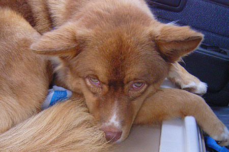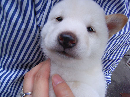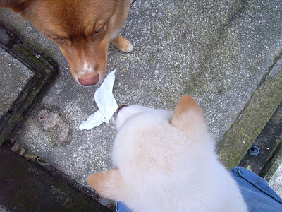 | 06.9.17「じたじたいじいじ。」 今日は動物病院へ診察にロペを連れて行きました。 相変わらず車は大のニガ手のロペ、出発前にふんばってイヤイヤしてたら、すっぽーん!と首輪が抜けて脱兎のごとく逃走、呼んだらちょっと考えてから戻ってきましたが、ふーっ、朝からあせった(−−; 乗せてしまえば諦めて大人しくなりますが、車内では→やっぱりじっとり、いじけむし。にっ、にらむなよう……。 病院では、待ち合い室では相変わらずのお行儀満点、控えめに愛想をふりまいて「おりこうねー」「キレイな目やなあ〜」となかなかの人気者っぷり。みねも、車を出してくれたみね母も内心「いつもと全然違うやん!」と思いながらも、ちょっと嬉しい。 しかし今日の診察がタイヘンでした。 尿道口の形で細菌感染しやすい場合があるのだそうで、それを診てもらってる間も診察台の上で「イヤー」って顔してたロペさん。 その後長期間結晶が再発をくり返しているので、結石が出来てないかエコー診断で、台の上でひっくり返されて恐慌状態。スタッフさん2人とみねとみね母の4人掛かりで押さえて、やっと保定できました。 緊張と不安でドキドキいってたロペ、血圧が上がったのか目の周りが真っ赤に充血してかわいそうだったけど、そして足を持って頭を抱きかかえてたみねもみね母もヨダレだらけになったけど、なんとかがんばれました。 結果、膀胱にしーがあんまりたまってなくて、細部までくっきりとは見えなかったのですが、大きな結石はないということで、とりあえずホッ。 そして家に帰ると→本日のスペシャルゲストが!福々しいわ〜〜。みねおばのしりあいのお家で生まれ、みね父のもう1人の妹の家にもらわれてきた白柴君です。 →ロペさんとご対面。何やら微妙な距離感……(笑)。 ロペ、みねが子犬を抱いててもヤキモチやいたり怒ったりせず、鷹揚な感じでしたが、意外なほど興味も示しませんでした。もらわれてきたばっかりで、あんまり動きまわったりする子じゃなかったからかな? ごりっぱな体格と勢いが良すぎるせいで他の犬に引かれて犬友達のほとんどいないロペの遊び相手になってくれるかな〜と密かに期待している、みねです。 |