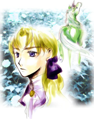 『聖・ライセンス(飯田晴子/アスカコミックスDX)』よりヘンリー=アン=ルーベント。 何やら美少女やカッコイイ兄さんたちやンマがいっぱい出て来てオトクな感じのマンガです(オイ^^;)。あまりにも少女マンガな題名と表紙に買うのためらってたんですが、この度意を決して(笑)1、2巻購入〜。ハートマークいっぱいの人物紹介には背中がぞびぞびしてますが…^^; 多分みねが一番好きなのはおカタい女嫌いの「そこの遊牧民の彼氏」でしょうけど、「泣き」に弱いみねは←この人に蹴っつまづいてもんどりうって転がってゆきました(笑)。 だって普段はツーンとしたいじっぱりなのに、熱に浮かされながら目にいっぱい涙をためて「メグ、愛は…愛はつかめないのかな?」ですよっっ。ぐはーーー(−−;どちらかといえば「クサイものにはツッコミを」気質のみねですがこれには参りました。もはや何を言う気力もございません。脱帽。 改めて自分のツボを力いっぱい!思い知らされた登場人物ですよ…。まあ泣いてればネコだろうが蟻だろうがクラリとくるんですが(それはそれでどうなん^^;)。 というわけでいつもより理性3割減でお送りしているみねでした^^;でも、とりあえず1枚描いて落ち着いたかな。フー。しかしやっぱり馬を描くのは楽しいです〜。小学生の頃は馬ばっか描いてました。 まあ、クサイものにはツッコミをいれつつ、絵になるから好きだったりもします。 |